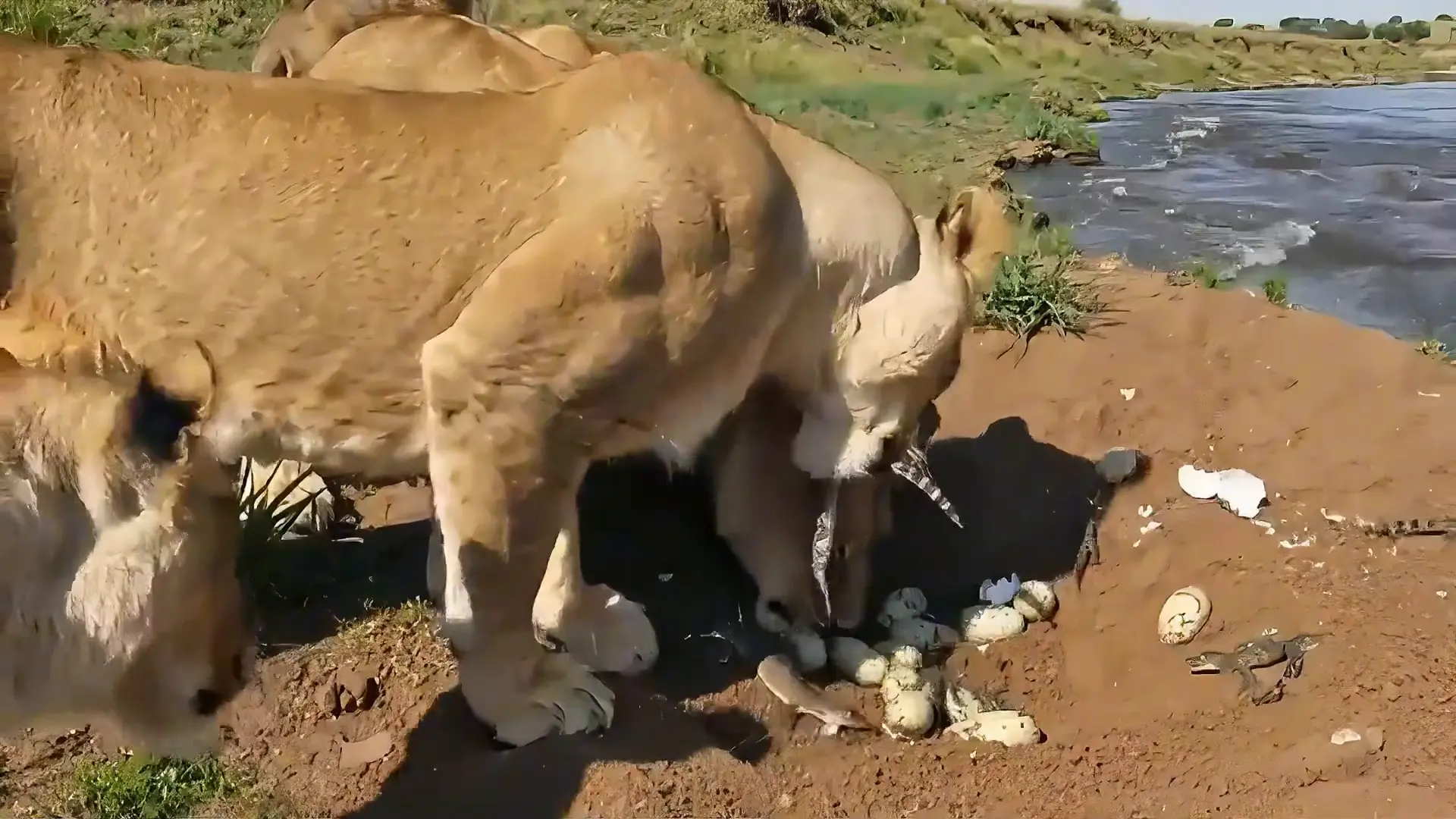 战争已毕后,狮群并未就此为止。它们循着气息找到了鳄鱼姆妈督察的窠巢。那些刚刚来到世上的小生命成了狮群的囊中之物。母狮们初始大快朵颐,吞食着鳄鱼蛋和幼崽。关于它们来说,这是一顿费劲宝贵的卵白质大餐。但关于鳄鱼家眷而言,这却是没顶之灾。