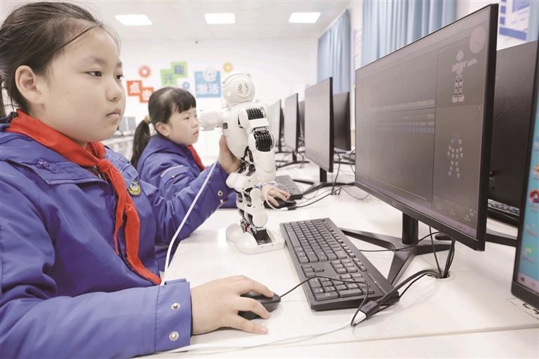铁五小学学生专注操作主说念主形机器东说念主。 本报记者 陈飞波 摄